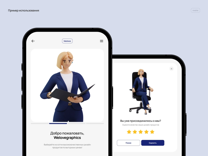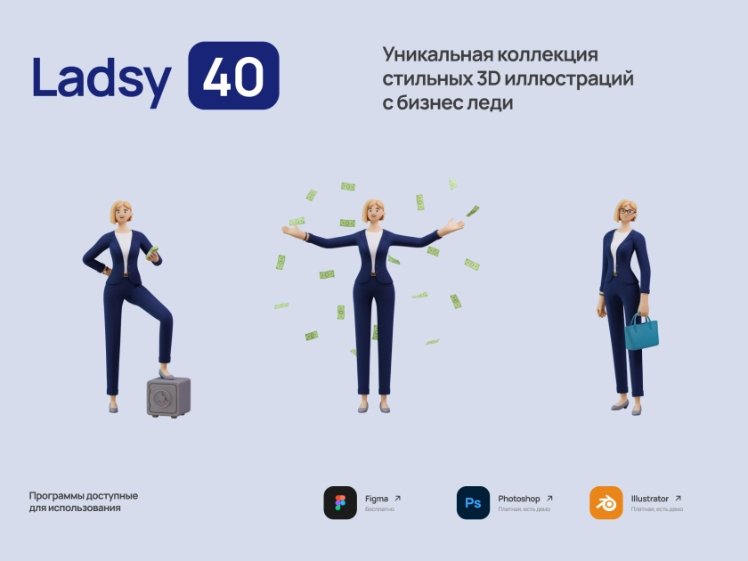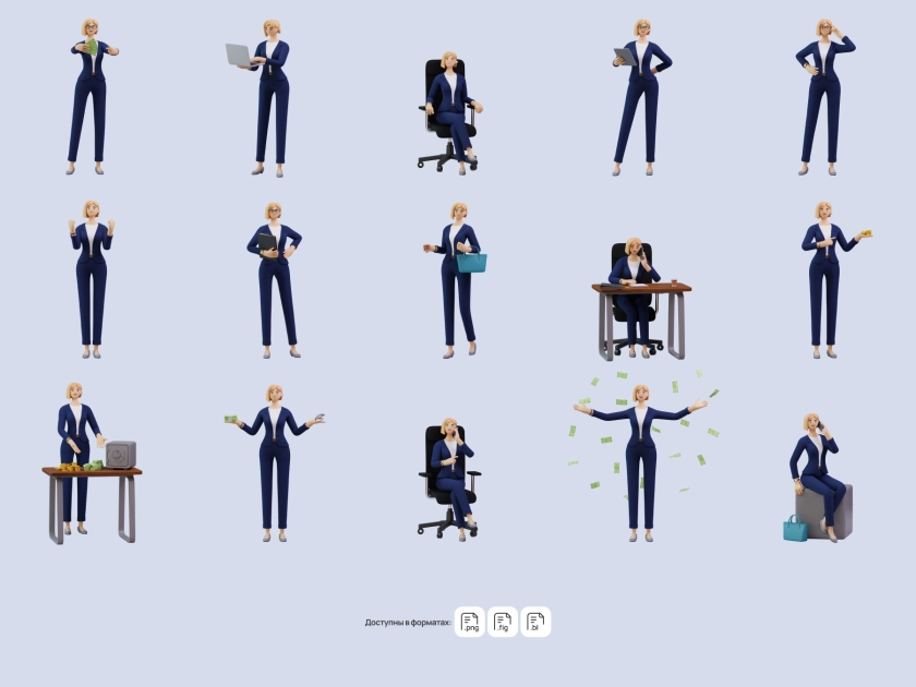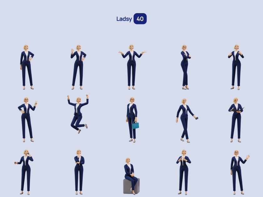 Уникальная и стильная коллекция из 40 поз бизнес леди. Отлично подходит для разработки веб-сайта, приложения или современной презентации на бизнес и финансовую тематику. Простая и легкая адаптация поможет быстро изменить цвет или позу персонажа в Blender.