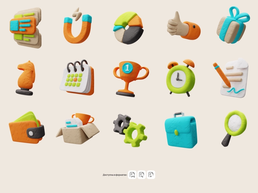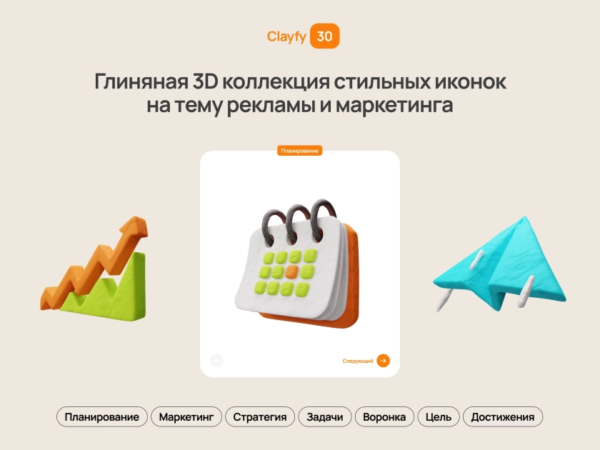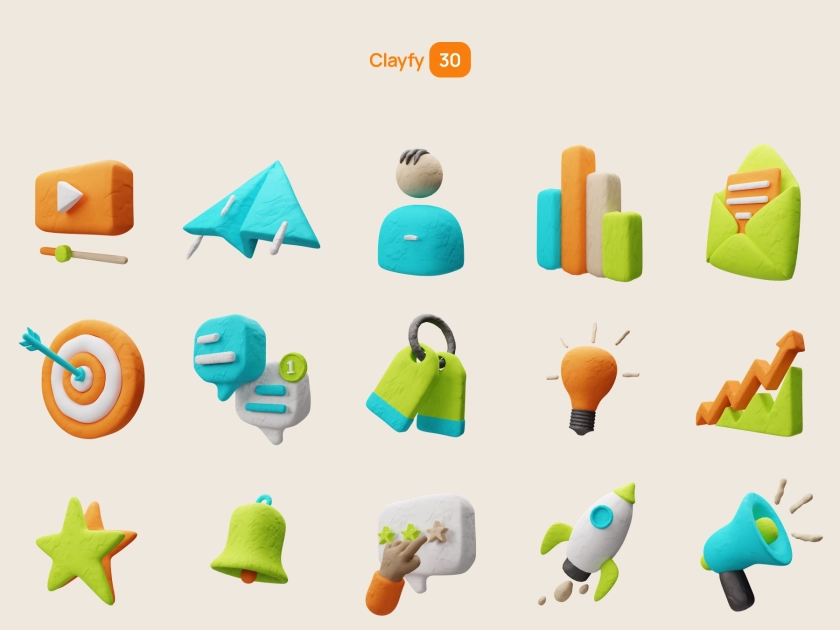 Стильный набор из 30 глиняных 3D-иконок на тему маркетинга и рекламы. Отлично подходит для разработки веб-сайта, приложения или современной презентации. Простая и легкая адаптация поможет быстро подогнать иконки под ваш стиль и проект.