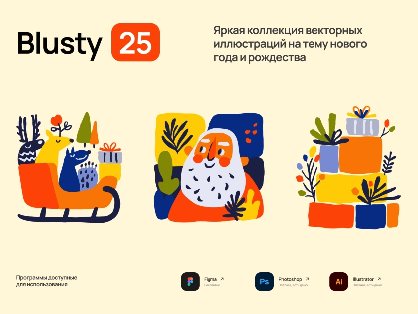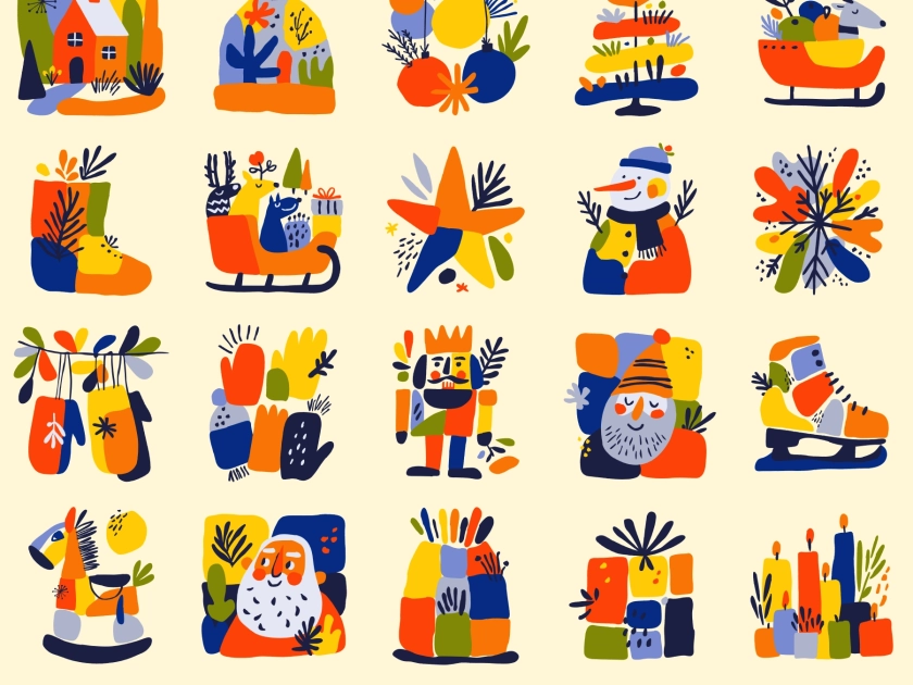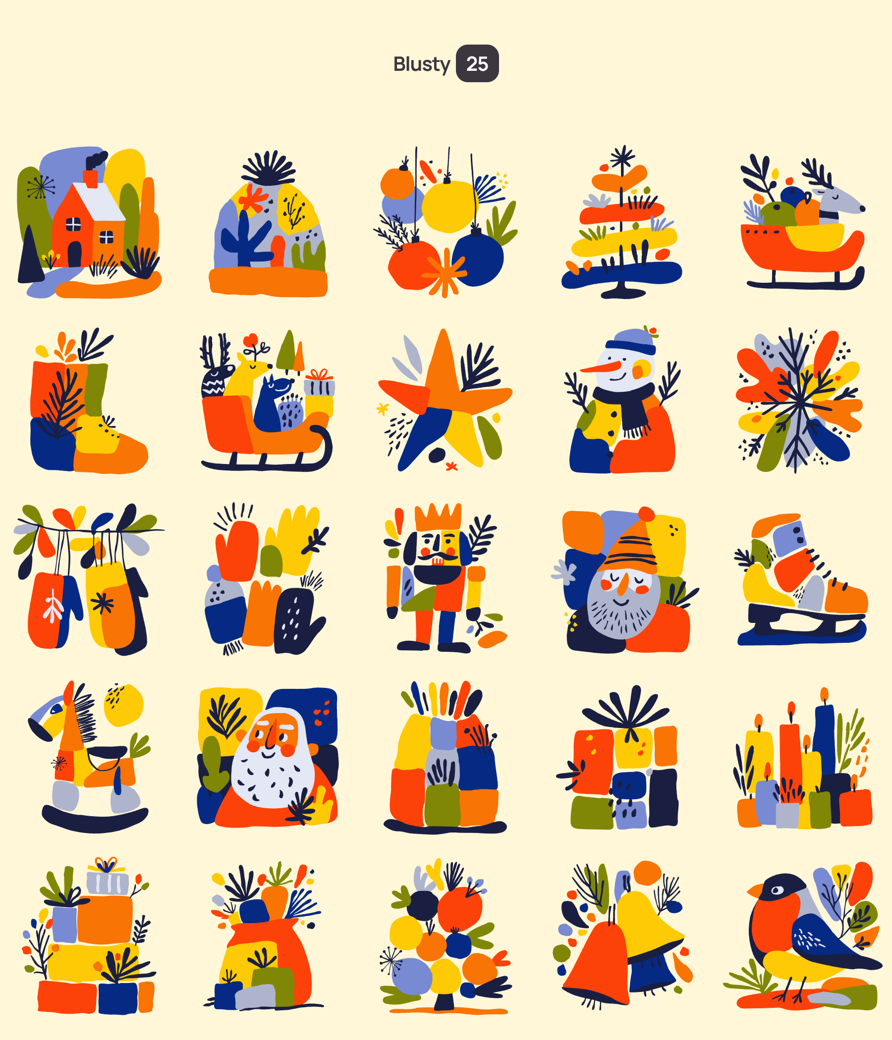 Набор из 25 ярких абстрактных иллюстраций на новогоднюю тематику. Идеально подходит для дизайна вашего веб-сайта, приложения, открыток, постеров и различной полиграфии. Простая и легкая адаптация поможет вам быстро интегрировать иллюстрации в ваши проекты с минимальными усилиями.