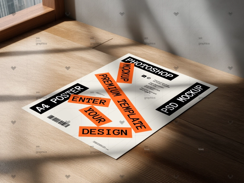 Мокап стильного А4 постера на деревянном столе. Отличный инструмент для демонстрации вашего дизайна в брендинговом дизайне, демонстрации портфолио или сайтах.