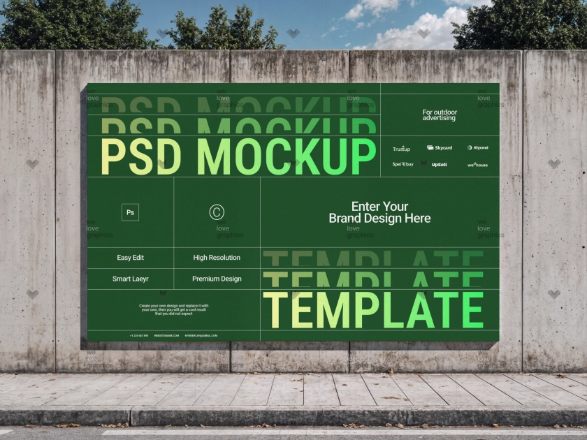 Стильный PSD мокапа большого билборда который висит вдоль дороги. Отличный инструмент для демонстрации вашего дизайна в брендинговом дизайне, демонстрации портфолио или сайтах.