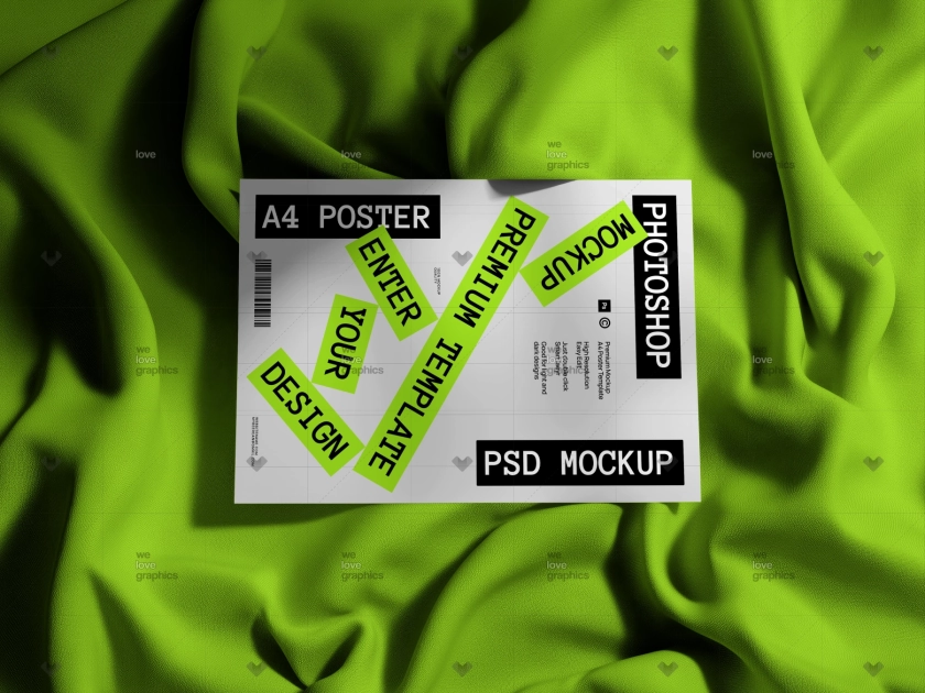 Стильный PSD мокап А4 постера на цветной мятой ткани. Цвет ткани и постер можно легко изменить. Отличный инструмент для демонстрации вашего дизайна в брендинговом дизайне, демонстрации портфолио или сайтах.