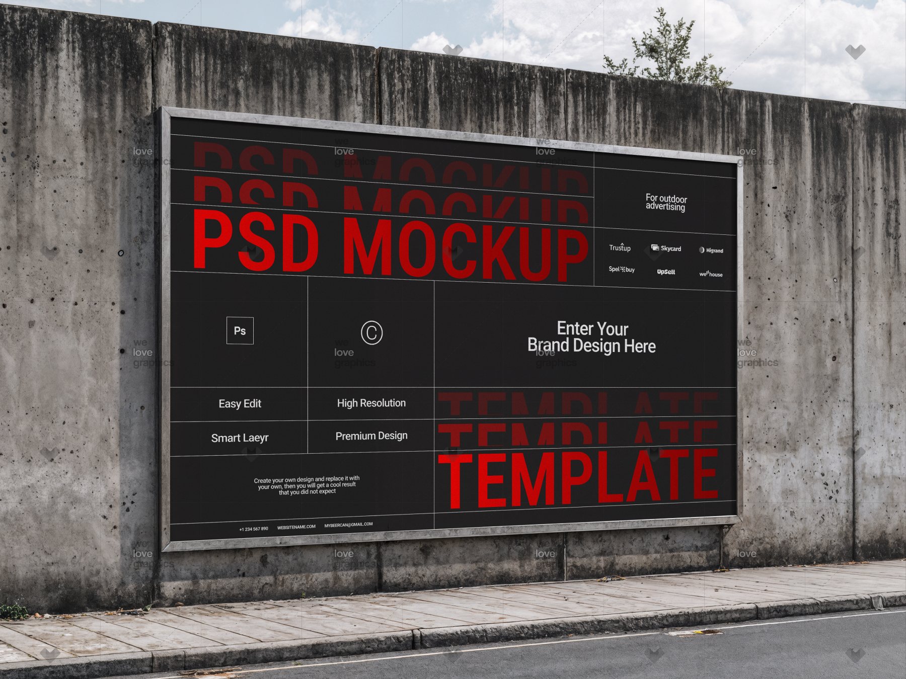 Стильный PSD мокап для большого рекламного билборда вдоль дороги. Отличный инструмент для демонстрации вашего дизайна в брендинговом дизайне, демонстрации портфолио или сайтах.