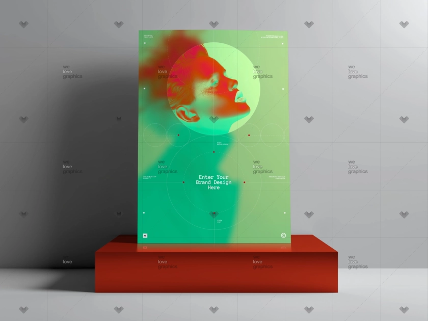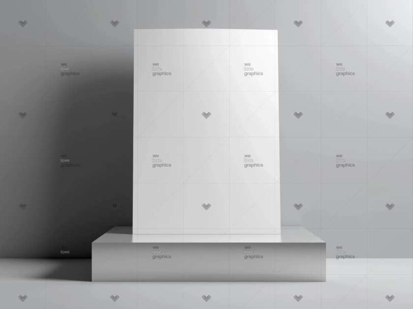 Стильный PSD мокап А4 постера на небольшом ярком пьедестале. Отличный инструмент для демонстрации вашего дизайна в брендинговом дизайне, демонстрации портфолио или сайтах.