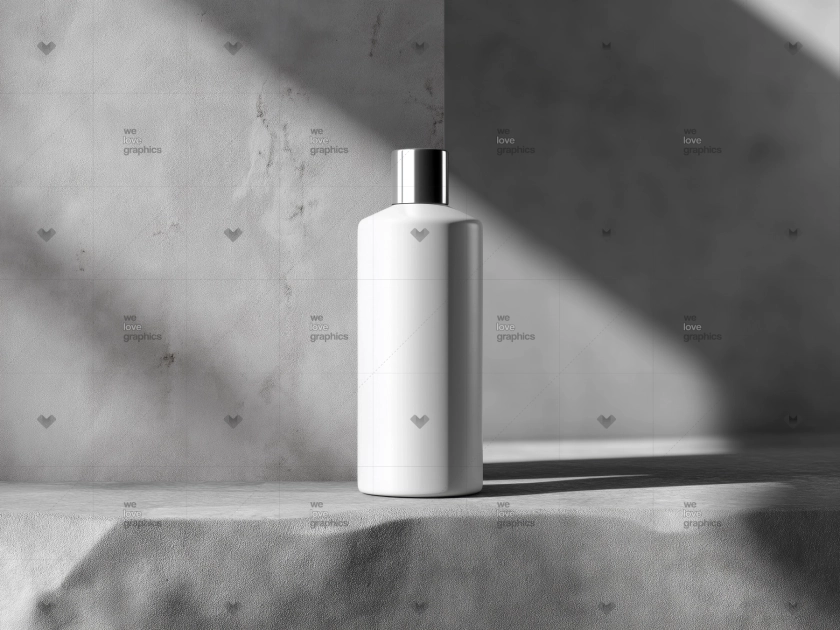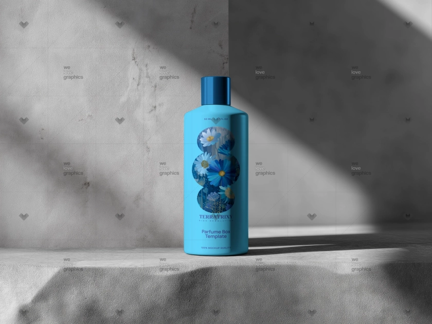 Яркий PSD мокап для бутылки духов, шампуня или брендинговой упаковки на фоне бетонной поверхности. Отличный инструмент для демонстрации вашего дизайна в брендинговом дизайне, демонстрации портфолио или сайтах.