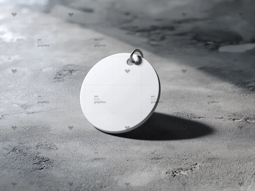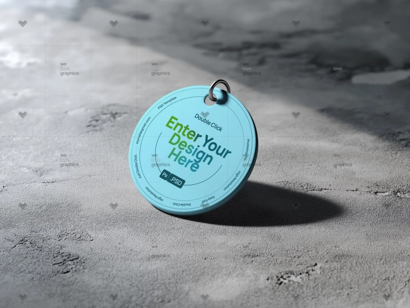 Яркий PSD мокап круглой бирки с металлическим кольцом на бетонной поверхности. Отличный инструмент для демонстрации вашего дизайна в брендинговом дизайне, демонстрации портфолио или сайтах.